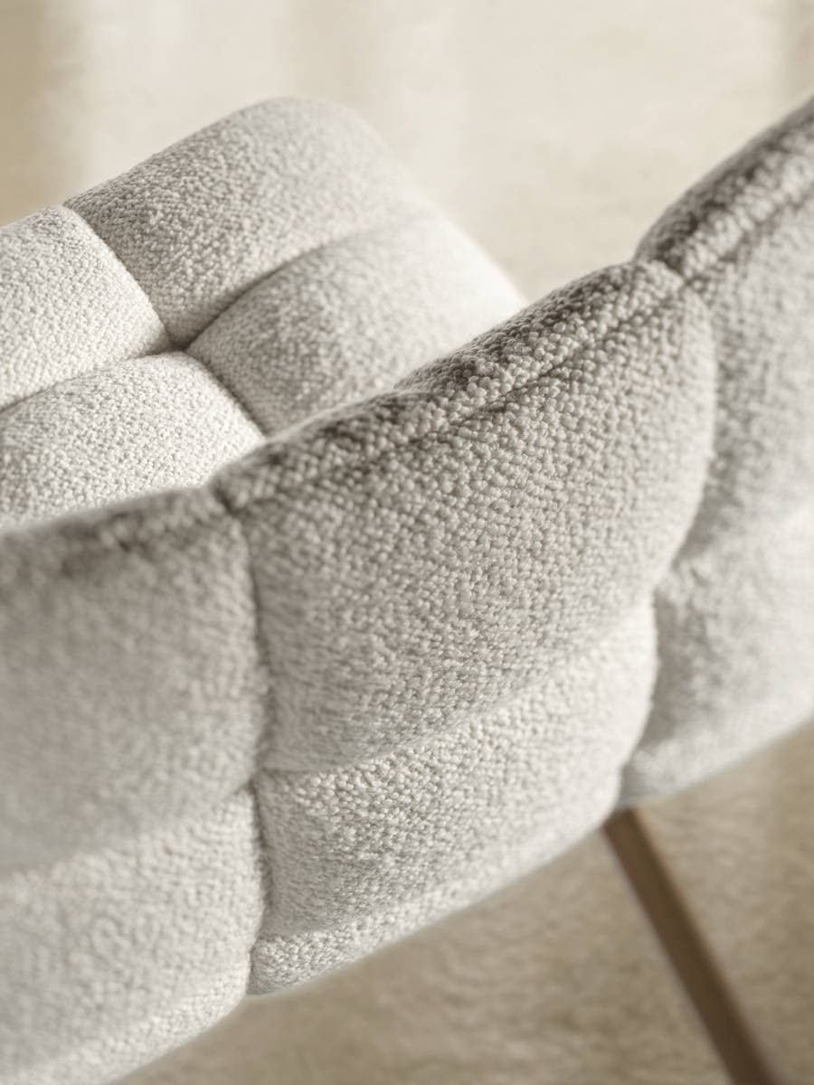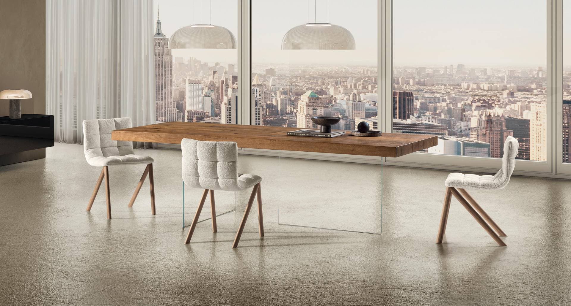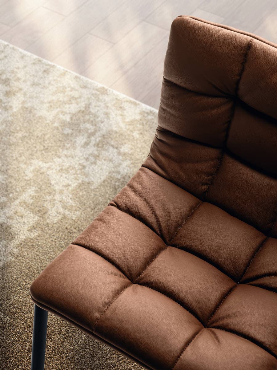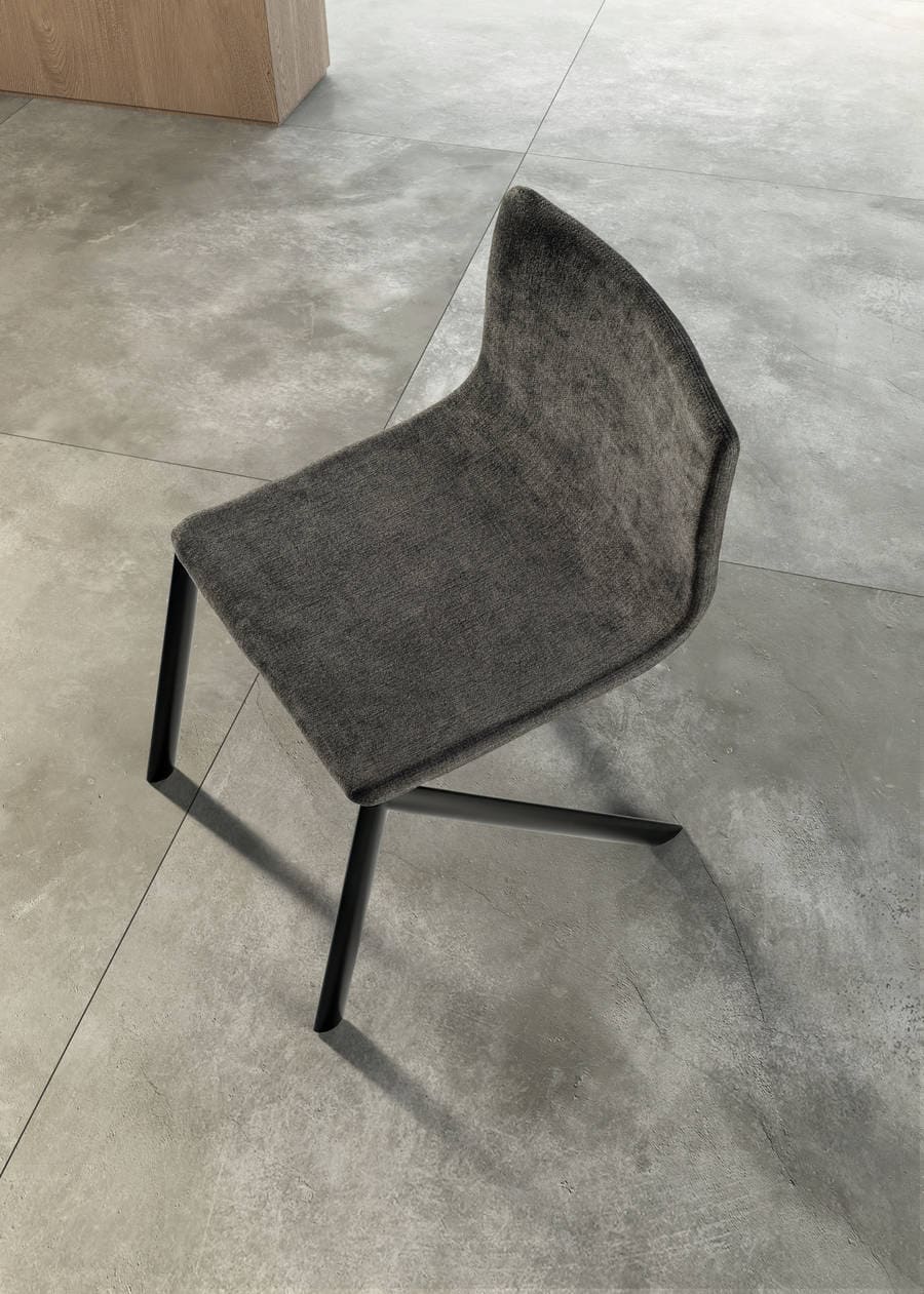 The inclined structure of the legs and the absence of supports at the back create an original effect of visual lightness, offering sprung and flexible comfort. The upholstery, featuring generous quilted padding, enhances the feeling of cosiness. Designed to adapt to different contexts, Mezz'aria is developed in a family of chairs that also includes plain or wooden seats and metal or oak legs.