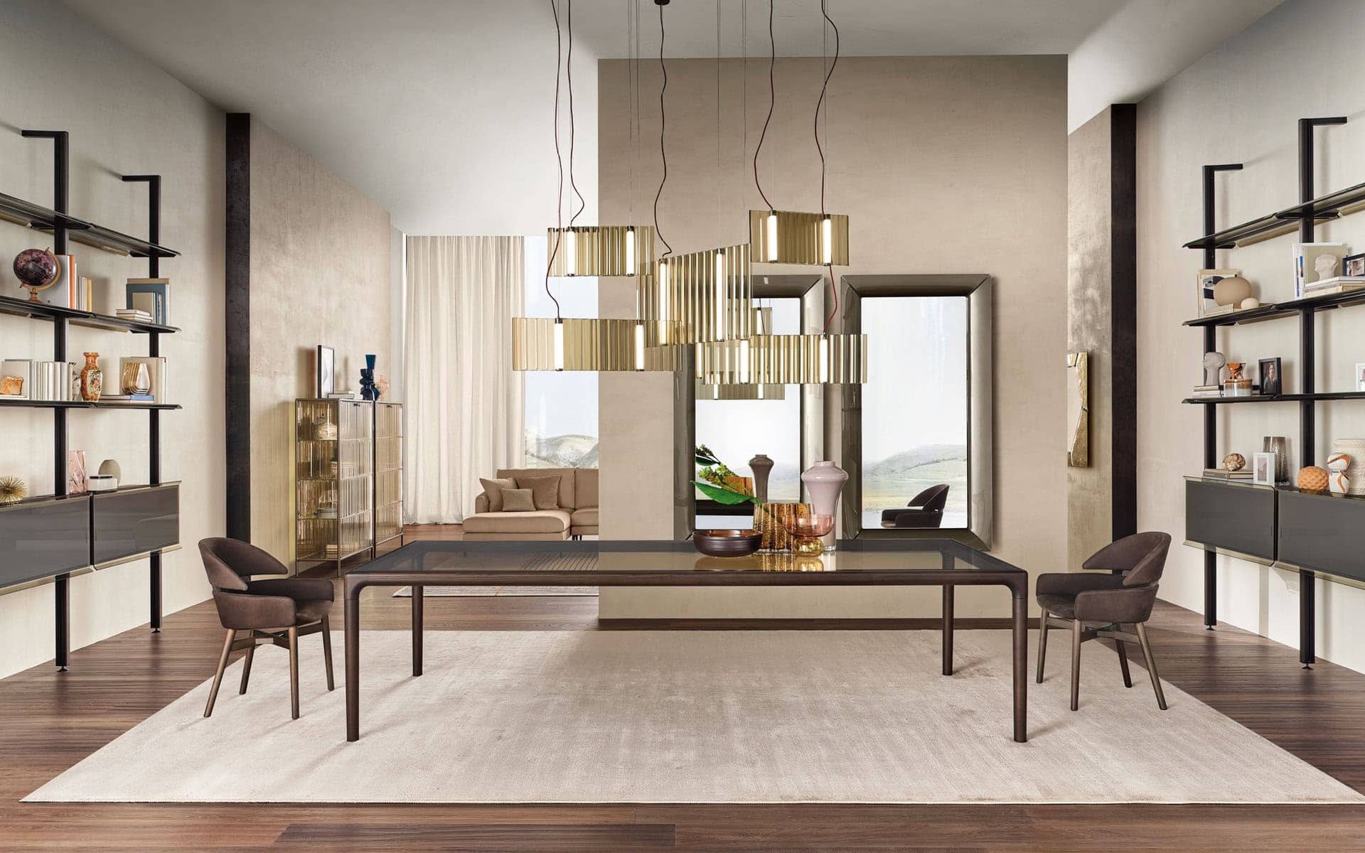 Table with 8 mm tempered glass top; solid wood structure available in Tobacco or Heat-treated Black finish.