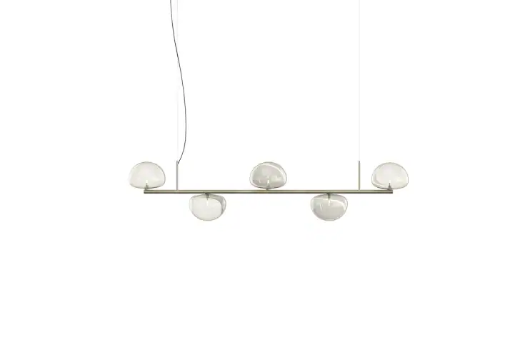 Δημιουργημένο από τον σχεδιαστή Andrea Lucatello, το φωτιστικό Dew είναι εμπνευσμένο από την πρωινή δροσιά, στην οποία παραπέμπει μέσω των αποχρώσεων που έχουν σχήμα συμπυκνωμένων σταγονιδίων νερού.