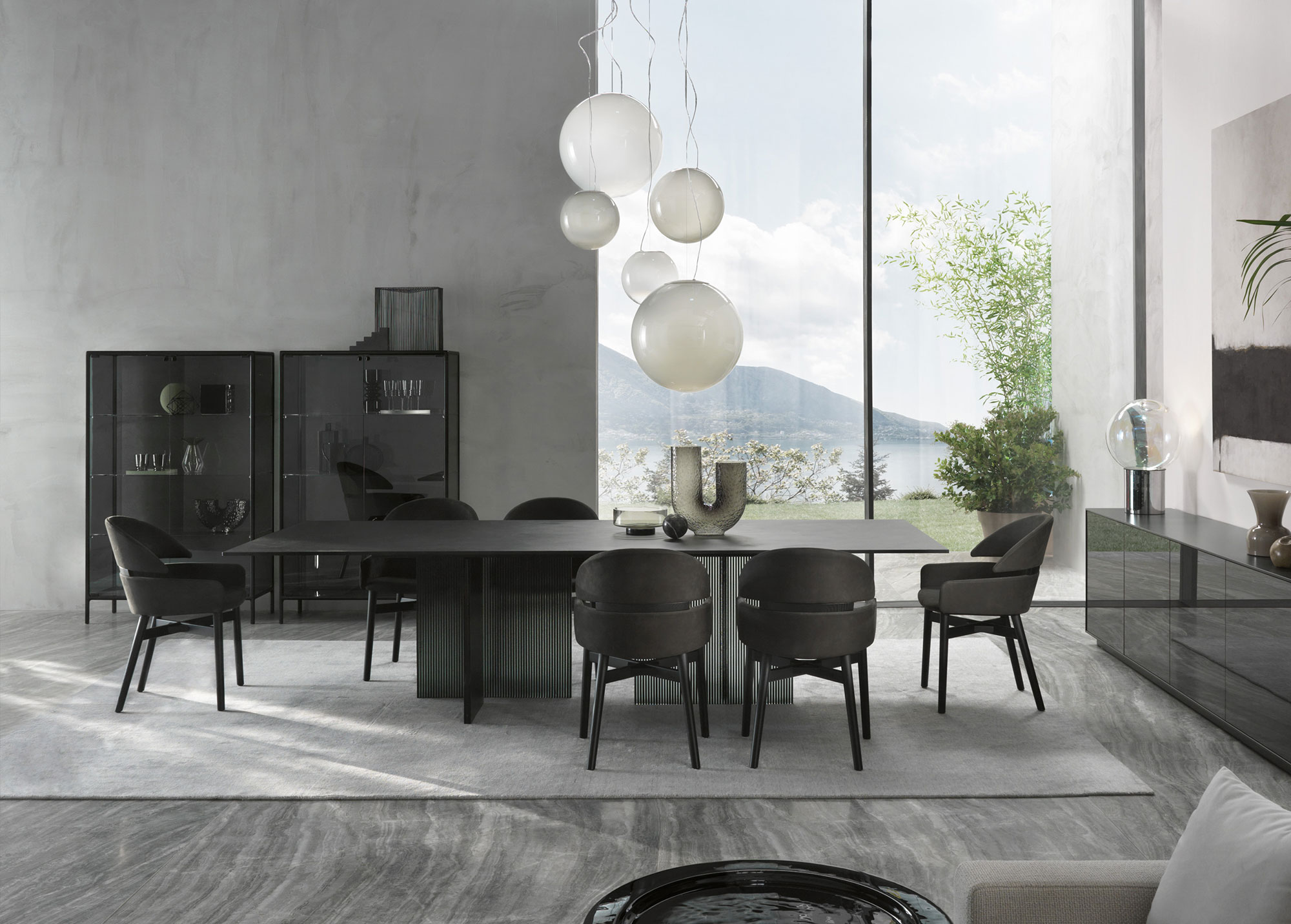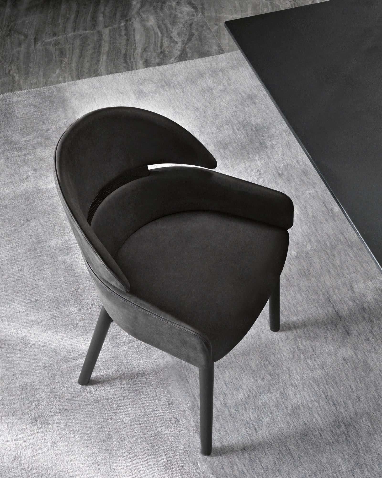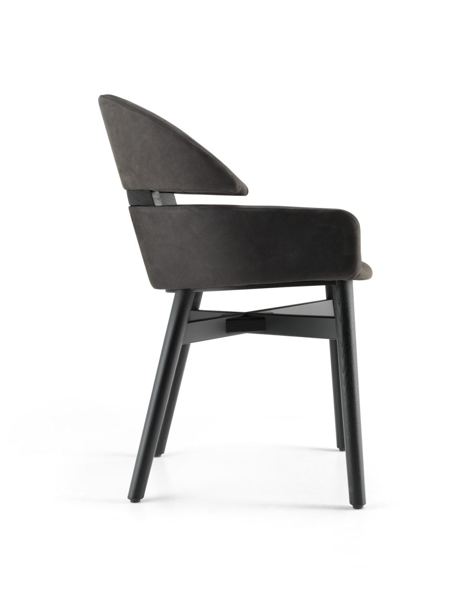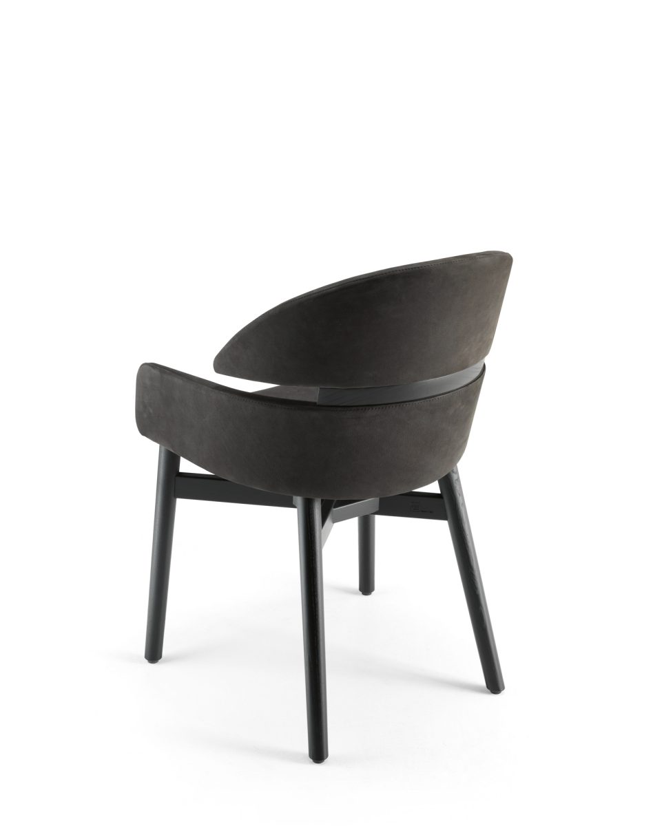 Καρέκλα με σκελετό από μασίφ ξύλο, διαθέσιμη σε φινίρισμα δρυός καπνού ή σε φινίρισμα μαύρου λακαρισμένου ανοιχτού πόρου. Το κάθισμα και η πλάτη είναι επενδυμένα με δέρμα ή νουμπούκ.