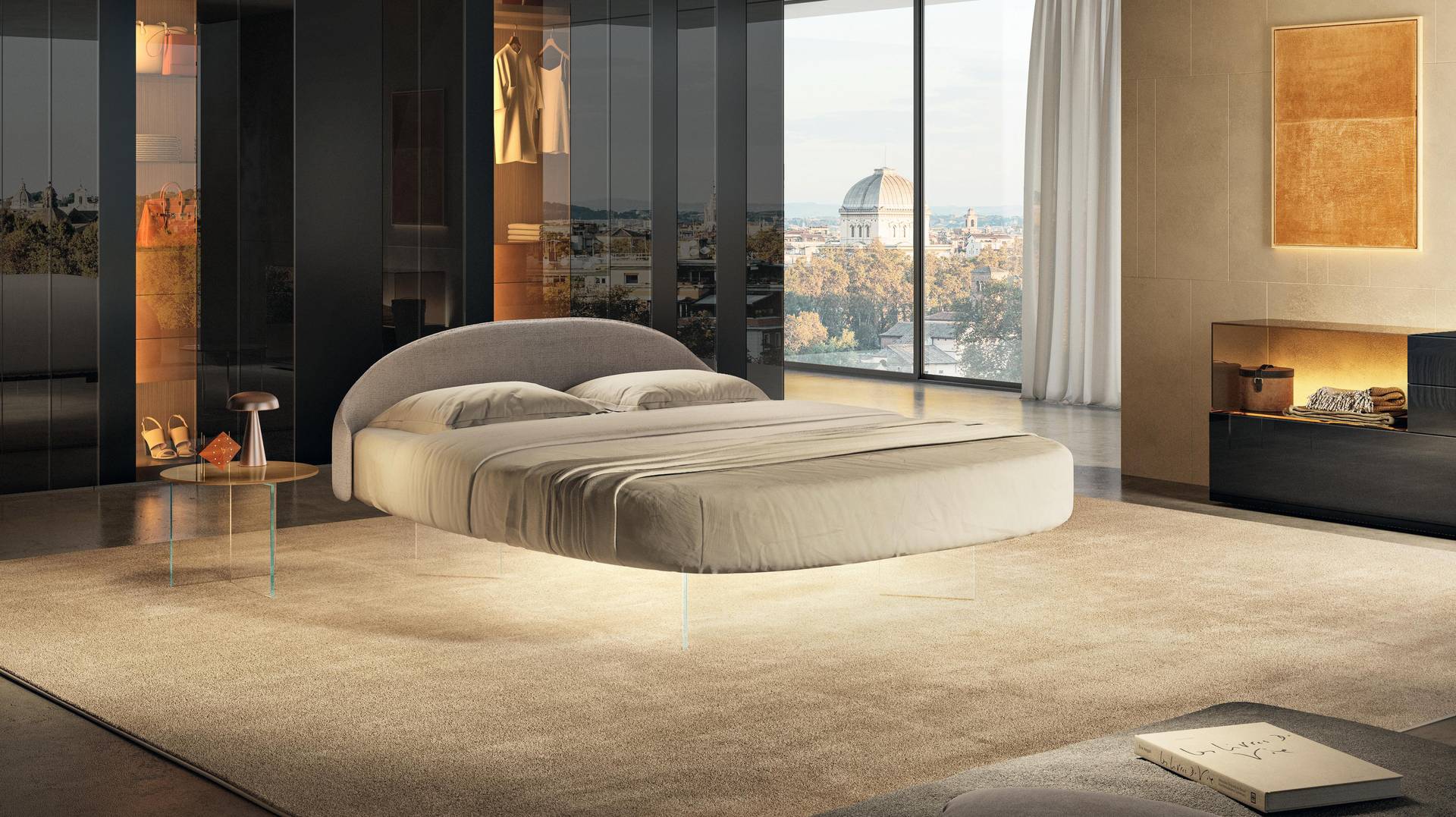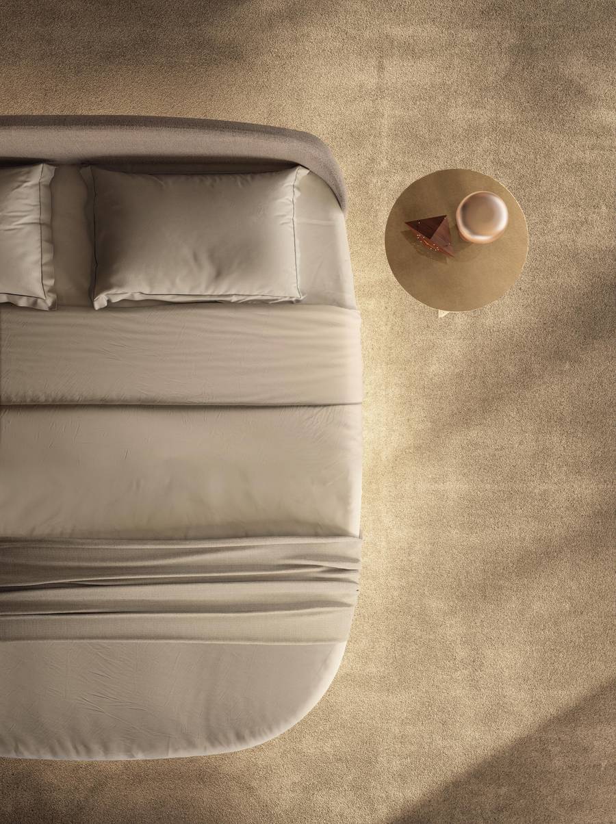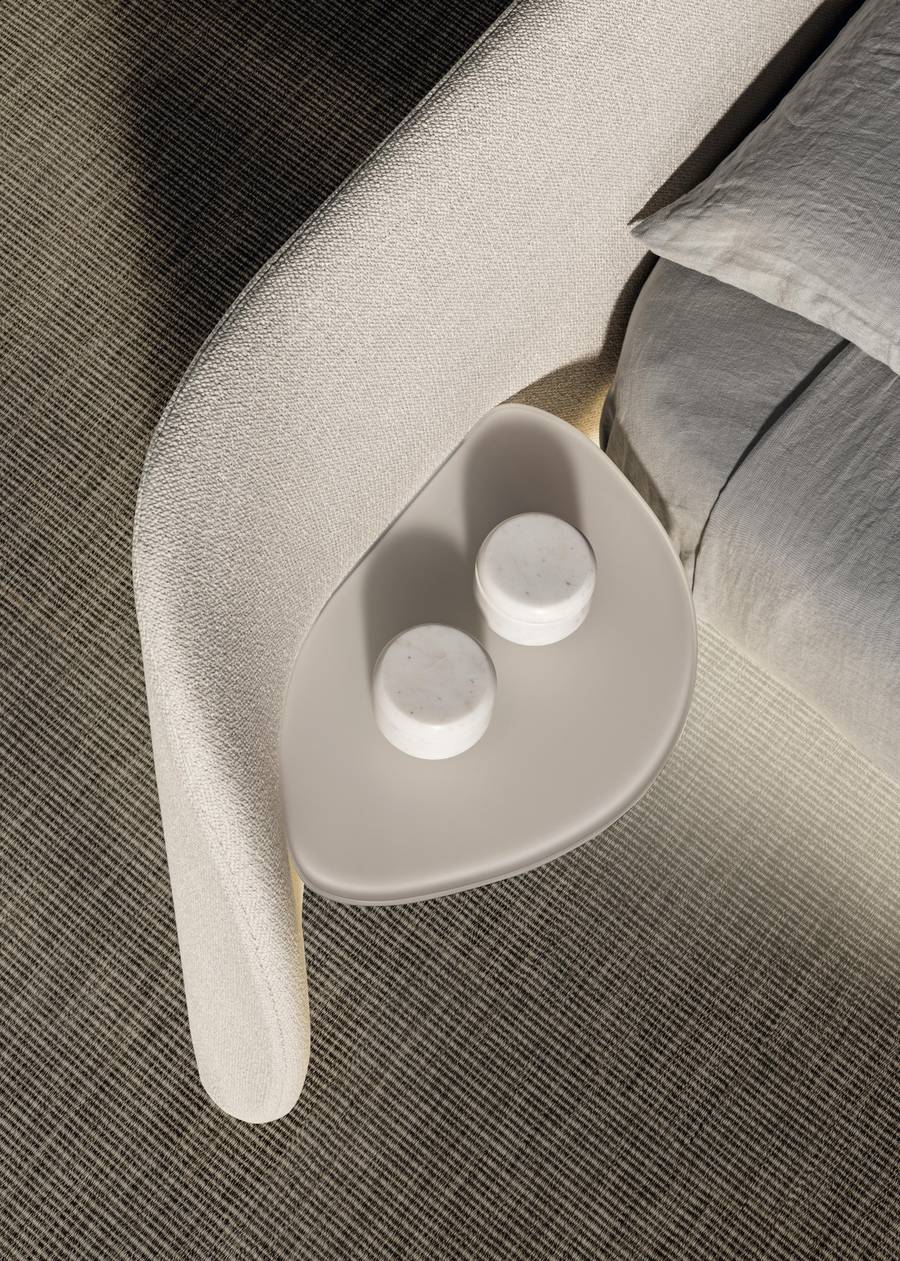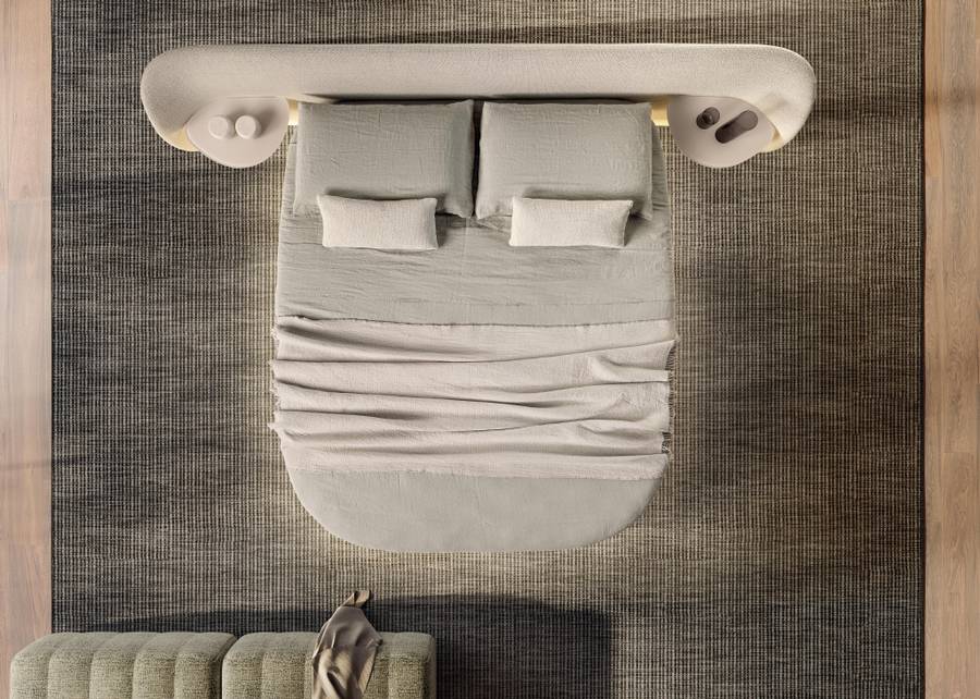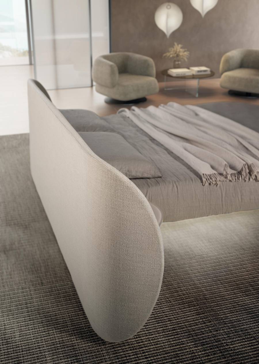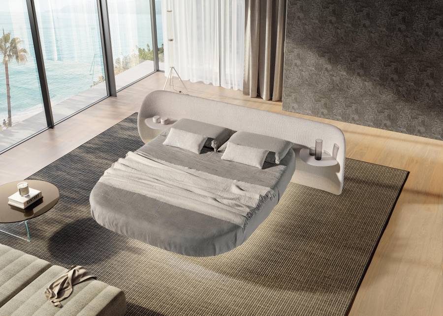 Τα στρογγυλεμένα σχήματα του στρογγυλού κρεβατιού Roundy Air, σχεδιασμένα για να μειώνουν τον όγκο, το καθιστούν ιδανικό τόσο για μεγάλα όσο και για πιο μικρά δωμάτια, εξασφαλίζοντας πάντα μια αρμονική ατμόσφαιρα.