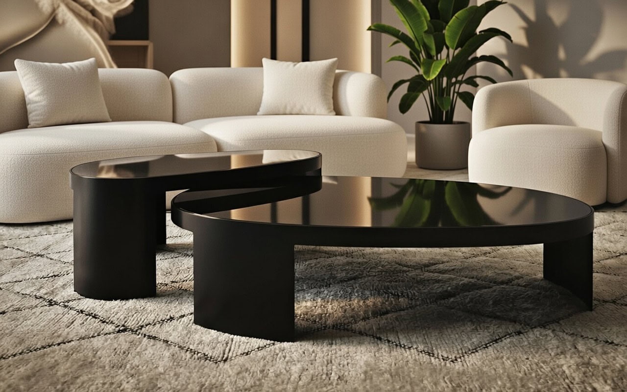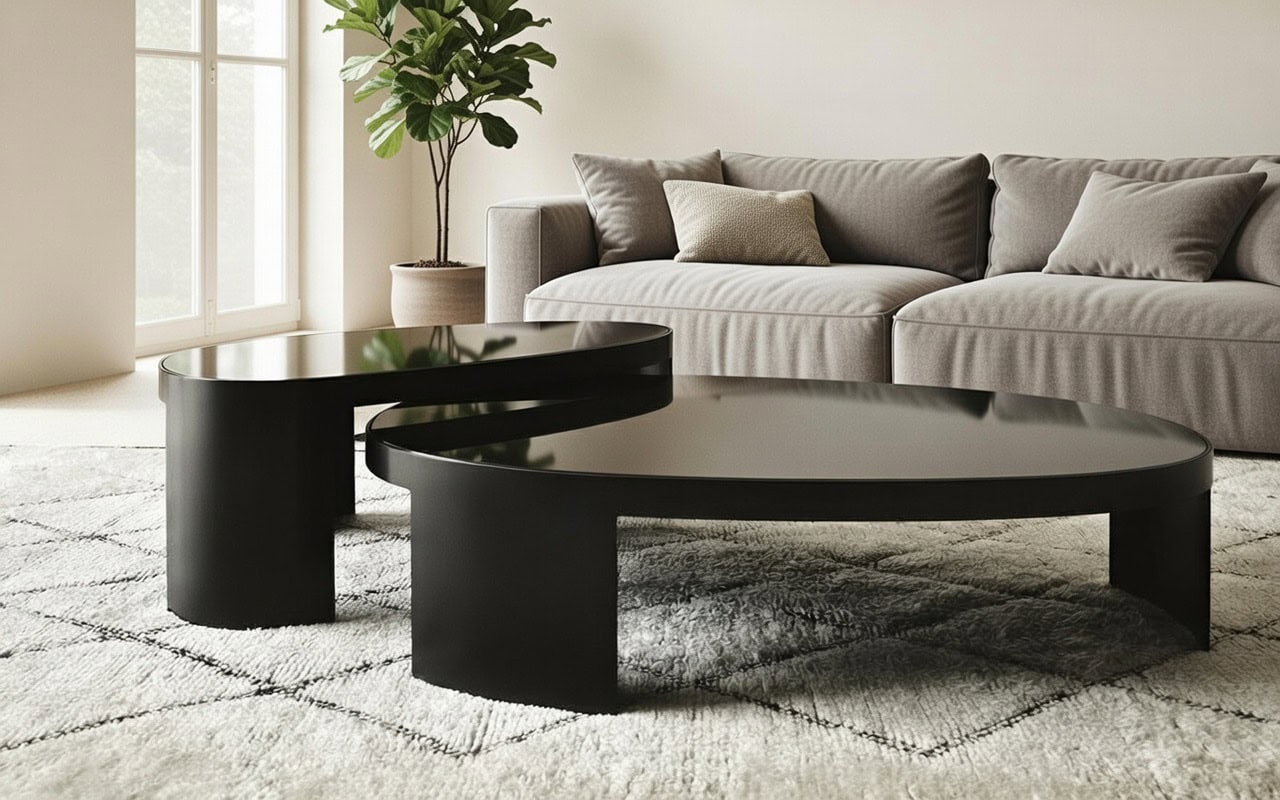 Οικογένεια τριών μεταλλικών τραπεζιών σαλονιού, με γυάλινη ή μαρμάρινη επιφάνεια, στοιβαζόμενα σε διάφορα μεγέθη ιδανικά για να ταιριάζουν με τους καναπέδες ή να στέκονται μόνα τους.